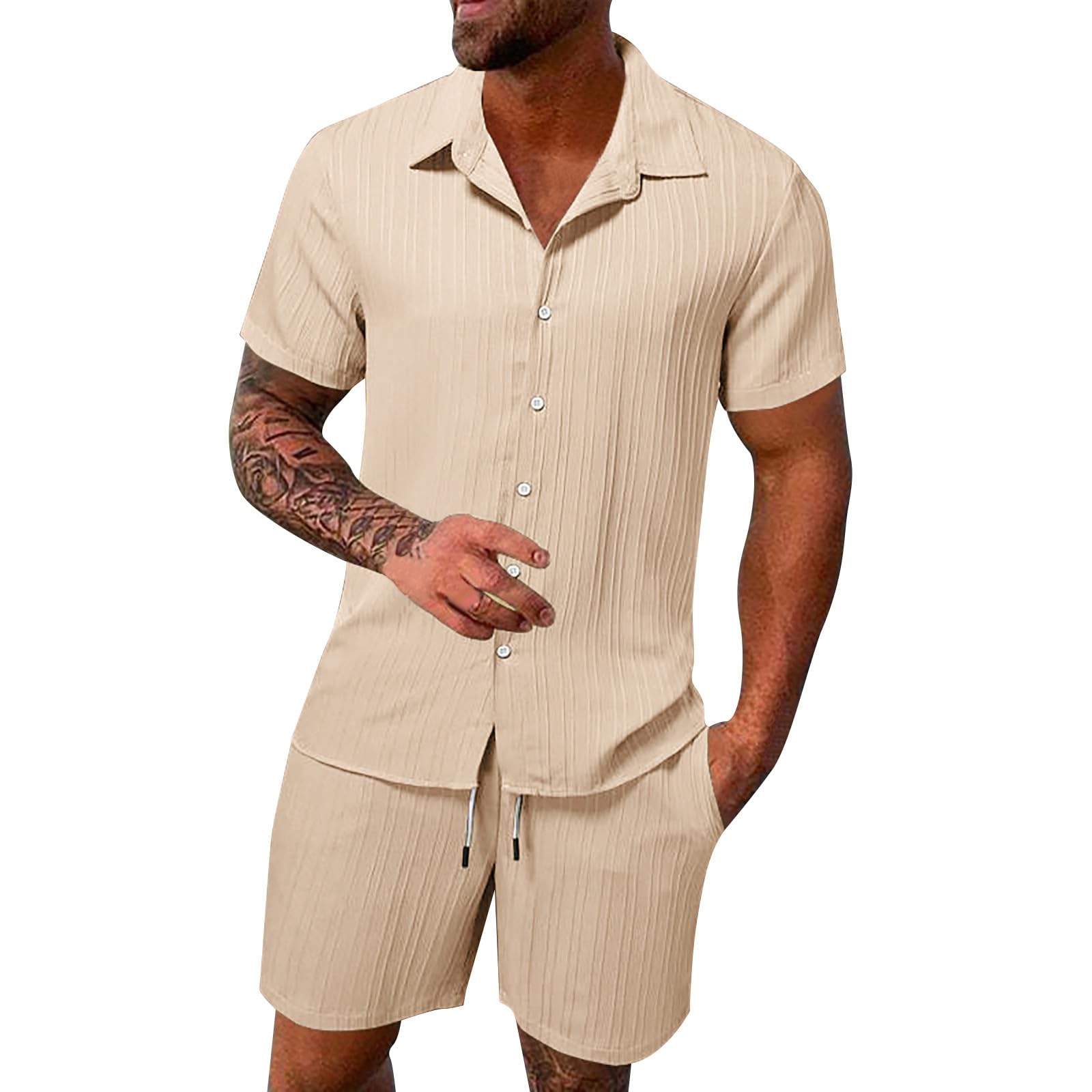 Zweiteiler Herren Leinenanzug Sommer Freizeitanzug 2-teilig Kurzarm Button-Up Revers Hemd und Shorts Beach Shirt Kurze Hose Set Baumwolle Leinen Anzug Jogginganzug für Urlaub Strand Alltag