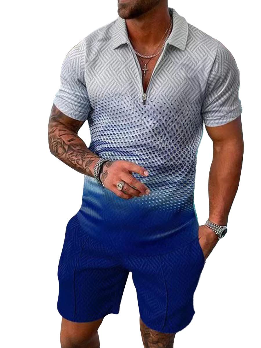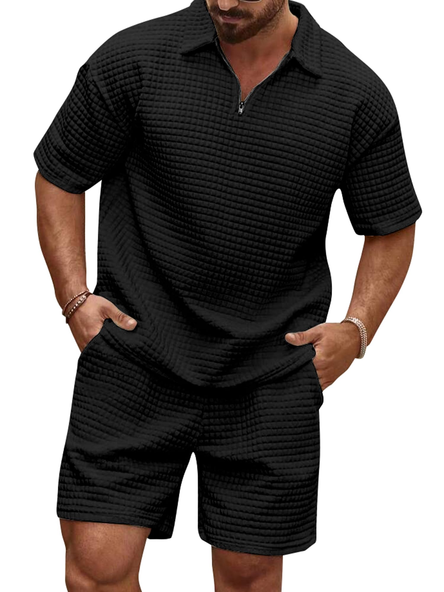 Herren 2 Pcs Waffel Polosuit Outfits Halb Zip Polo Shirt und Short Texturiert Sommer Set S-3XL